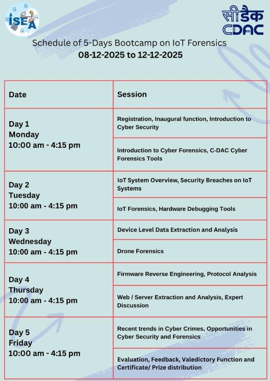 The 5-Day Bootcamp on IoT Forensics is organized by the C-DAC Research Team on IoT Forensics. This training program is conducted under the MeitYβs ISEA Phase III project, with the objective of creating awareness in emerging domains of Cyber Security among engineering students and preparing them to play a vital role in strengthening the nationβs digital security. The bootcamp brings together a dynamic blend of theory sessions, hands-on practice, and expert-led discussions on real-world case studies, providing participants with both practical skills and valuable opportunities to interact with leading professionals in this dynamic field.