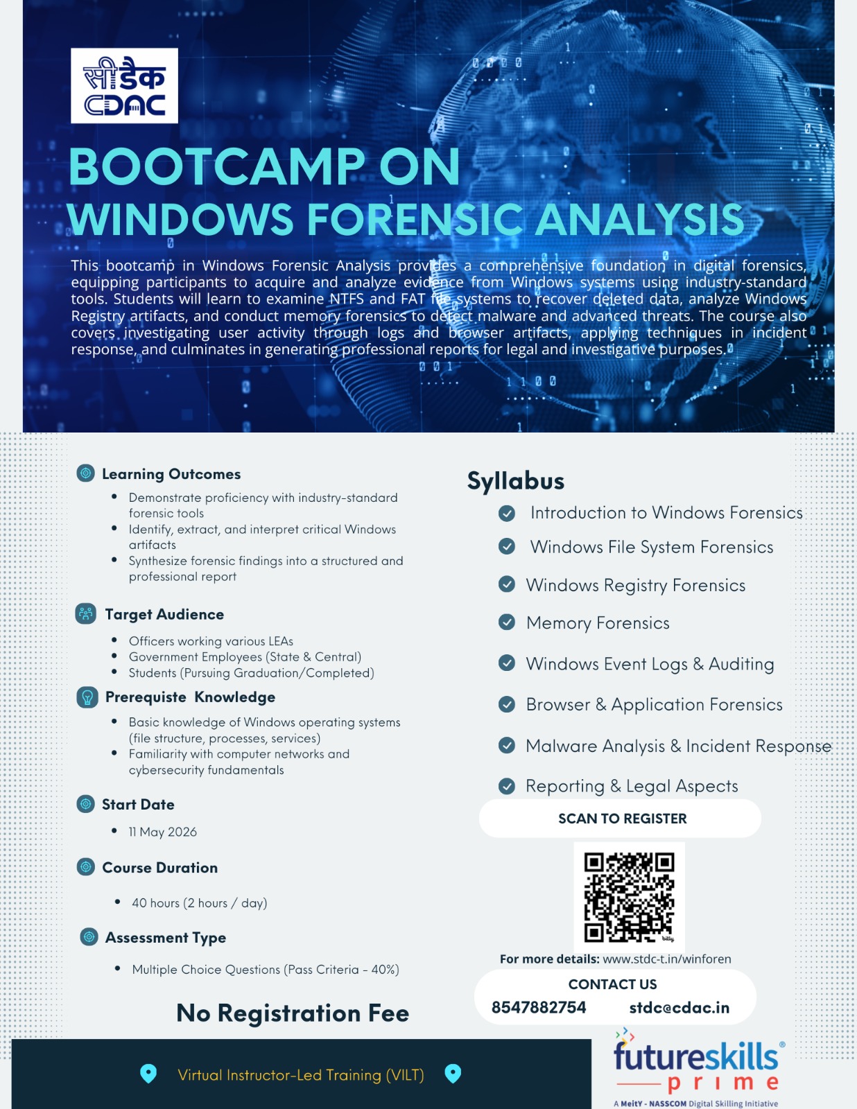 This bootcamp in Windows Forensic Analysis provides a comprehensive foundation in digital forensics, equipping participants to acquire and analyze evidence from Windows systems using industry-standard tools. Students will learn to examine NTFS and FAT file systems to recover deleted data, analyze Windows Registry artifacts, and conduct memory forensics to detect malware and advanced threats. The course also covers investigating user activity through logs and browser artifacts, applying techniques in incident response, and culminates in generating professional reports for legal and investigative purposes.